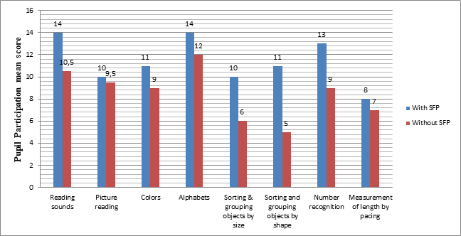 Analyzed data presented in Figure 3 clearly shows that pupils in ECDE centres with a SFP scored higher in all the parameters under investigation compared to the centres without a school feeding programme. The mean scores of the parameters under investigation included for schools with and without a feeding programme respectively were; reading sounds (14, 10.5), picture reading (10, 9.5), colours (11, 9.5), alphabets (14, 12), sorting and grouping by size (10, 6), sorting and grouping by shape (11, 5) number recognition (13, 9) and measurement of length by pacing (8, 7). These finding indicate that the pupils in schools with a feeding programme were performing much better compare to those without. These study findings affirm existing documentation on the effect of SFPs on learner class participation by (Werner 1982) study established SFPs increase the benefits of school participation, thereby posing positive impact on learners’ academic performance. The increased school participation due to SFPs also lead to learner attentiveness, motivation, physiological comfort, and an increased readiness to learn hence positively impacting learning. Health, nutrition and psychological development of a child are all linked which influences the consumption of food and absorption. In addition, a hungry child is dull and less active reducing their interaction with the environment. It is therefore important to understand how the class participation can be improved through offering some basic needs of the children particularly food. The analysis of the head teachers’ responses indicated that out of the 20 pre-schools under review, only 6 schools representing a paltry 30% had established a functional SFP for the pupils. All (100%) of the head teachers acknowledged the necessity of the school feeding programmes, but added that parents especially in the rural areas had a reluctance to finance the SFP due to their weak financial base. In addition, 13 (65%) of the head teachers noted that their schools did not have the prerequisite infrastructure such as; kitchen, utensils and personnel to roll out a SFP. The findings are consistent with WFP report (2010) which points that in regions where the social economic status is low, SFP is mainly introduced to improve academic performance rather than to increase enrolment. The study was based on Maslow’s theory of the hierarchy of needs which states that the physical needs such as food ought to be met before moving to higher needs in the hierarchy. This implies that those children whose needs are met through SFP are contented and happy since the learning environment is conducive.